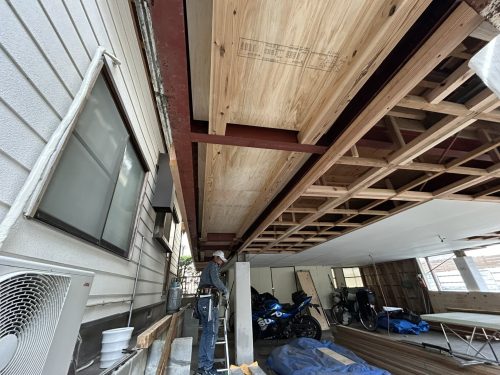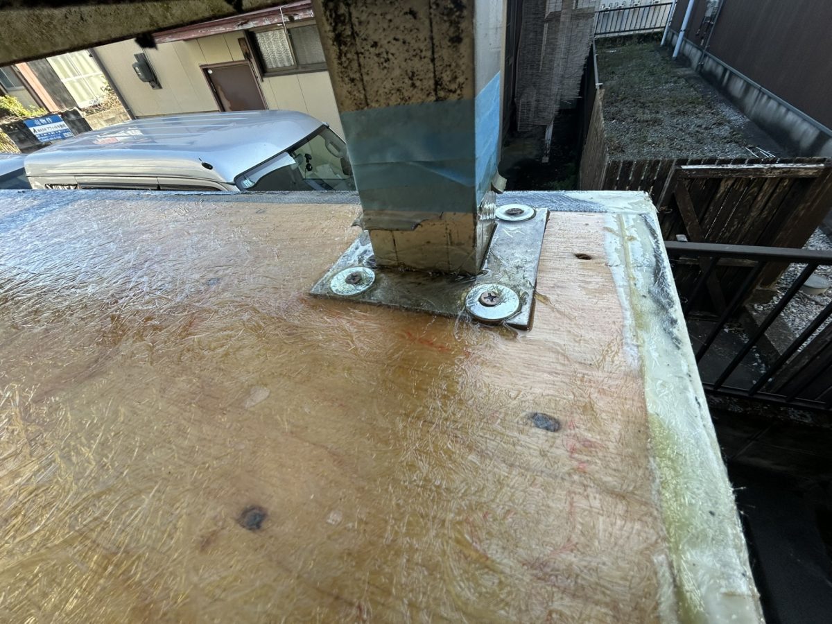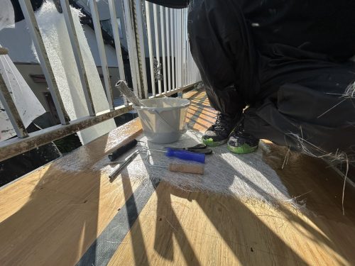 今回の現場ではもともとモルタル仕上だったものを、重量も考え、木下地と相性の良いFRP防水でやりかえました。
